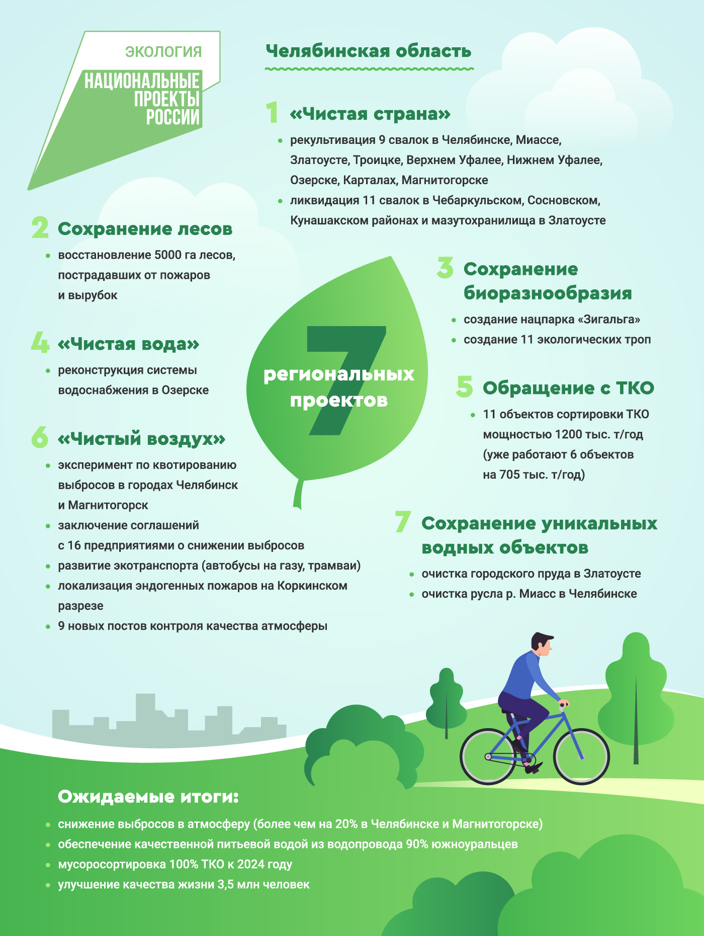 На территории области в рамках нацпроекта «Экология» реализуются семь федеральных проектов. Все они нацелены на улучшение экологической обстановки в регионе. Работа, по словам главы региона, масштабная и идет по разным направлениям. «Круг задач, которые поставлены перед нами в рамках реализации национального проекта, разнообразны – от кардинального снижения выбросов загрязняющих веществ в атмосферный воздух, создания инфраструктуры для становления новой системы обращения с твердыми коммунальными отходами, рекультивации объектов накопленного вреда, реабилитации водных объектов, имеющих важное социально-экономическое значение для региона, которые сегодня испытывают повышенное антропогенное воздействие, до развития экологически ответственного отношения жителей и гостей региона к его природным богатствам», – подчеркивает губернатор Челябинской области Алексей Текслер.