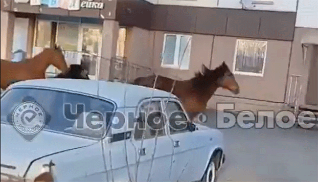 Лошади пронеслись вдоль многоэтажных домов мимо парковки и центра детского развития.