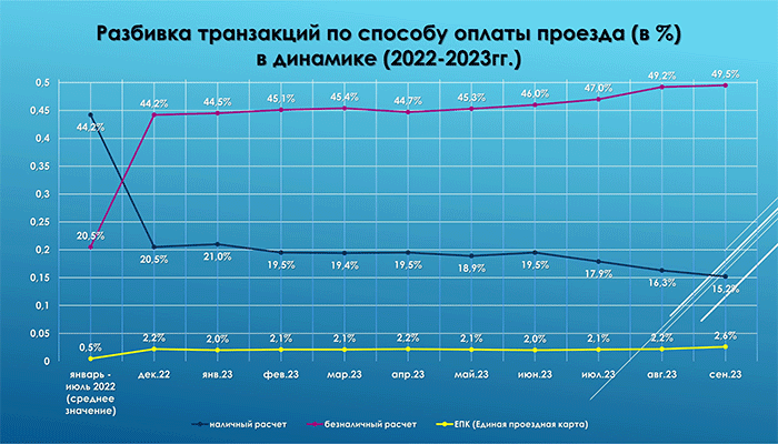 В течение 2023 года продолжается постепенное снижение оплат наличным способом – на 30 сентября их доля составляет уже 15,2%, в то время как безналичным путем 49,5%. Стабильно растет количество пассажиров, использующих ЕПК при оплате проезда, – сегодня это 2,6% от всех расчетов.