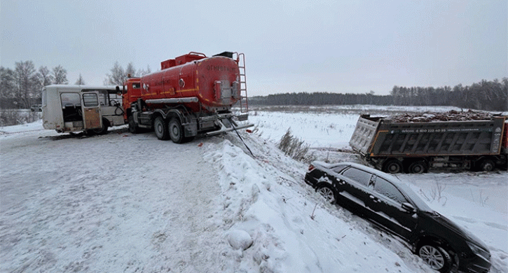 Ранее сообщалось, что около железнодорожного переезда у деревни Шумаки водитель рейсового автобуса, объезжая препятствие, не убедился в безопасности маневра и столкнулся со встречным грузовиком, после чего автобус наехал на стоящий на обочине бензовоз.