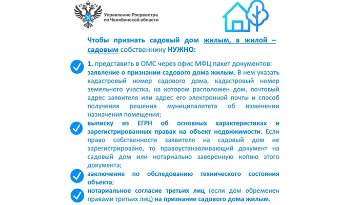 Для того, чтобы признать садовый дом жилым, а жилой – садовым, собственнику нужно представить в орган местного самоуправления через МФЦ пакет документов. Он включает в себя заявление о признании садового дома жилым, выписку из Единого государственного реестра недвижимости об основных характеристиках и зарегистрированных правах на объект недвижимости и заключение по обследованию технического состояния объекта, нотариальное согласие третьих лиц (если дом обременен правами третьих лиц) на признание садового дома жилым.