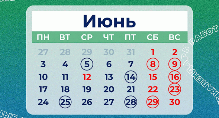 В июне 30 календарных дней, из них – 19 рабочих, 11 выходных и праздничных.