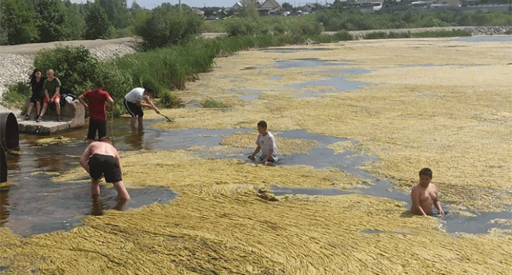 Жители села Архангельское распространяют кадры реки Биргильда: водоем практически целиком покрыт тиной и грязью, так, что не видно воды.