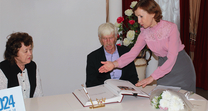 Начальник отдела ЗАГС Ольга Абраменко вручила паре поздравительный адрес и памятный подарок от имени временно исполняющего полномочия главы Коркинского округа Александра Орла и председателя Собрания депутатов Николая Швеца. Константиновы оставили подписи в Книге почета юбилейных супружеских пар и исполнили вальс.