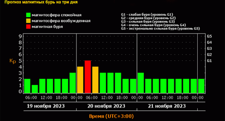 Как следует из графика, обновляемого в режиме реального времени, буря уровня G1 ожидается в первой половине понедельника, возмущения магнитного поля достигнут пяти баллов из девяти возможных.