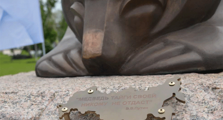 Оригинал арт-объекта с цитатой президента РФ «Медведь свою тайгу никому не отдаст» находится в Снежинске.