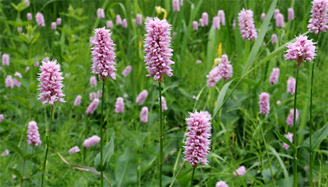 Горец змеиный (змеевик большой). Растет по берегам рек, прудов, на травянистых болотах. Здесь лекарственную ценность представляют корневища. Они содержат фенольные кислоты и их производные, катехины, хлорогеновую, эллаговую и пара-Кумаровую кислоты. Наличие всех этих веществ обеспечивает антиоксидантное, противовоспалительное и кровоостанавливающее действие.