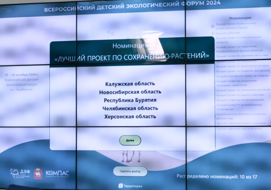 Номинации проектов разбиты на семь треков: «Чистая страна», «Чистая вода», «Чистый воздух», «Сохранение биоразнообразия», «Экологическое просвещение», «Особо охраняемые природные территории», «Цифровые технологии в экологии». Официальных номинаций – 17, команде Челябинской области выпала тема «Лучший проект по сохранению растений».