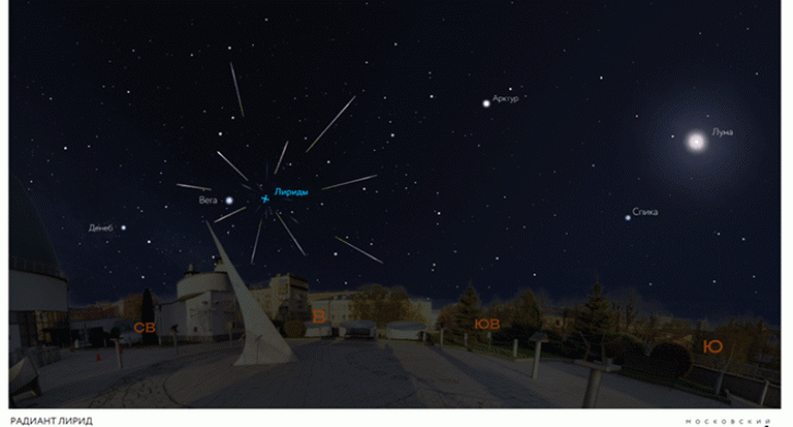 Ранее сообщалось, что с 15 по 29 апреля активизируется метеорный поток Лириды, пик которого придется в ночь на 22 апреля. По прогнозам Международной метеорной организации, ожидается до 18 метеоров в час.