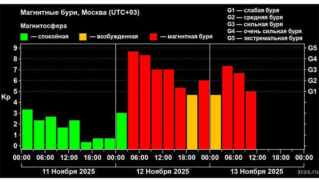 В пике, который наблюдался 12 ноября, геомагнитный индекс Kp достигал значений G4.3-G4.7, что ни разу не наблюдалось в 2025-м году, но ожидавшийся высший уровень G5 в итоге достигнут не был.