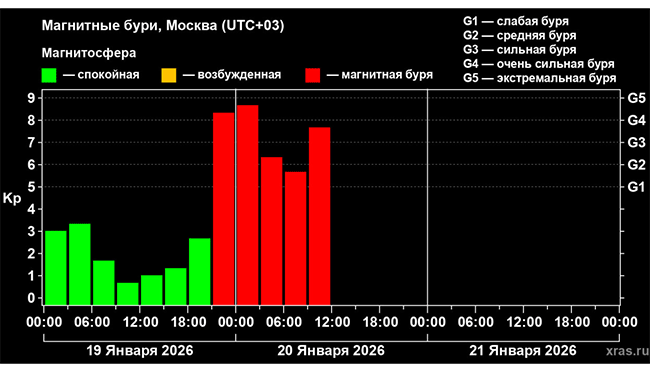 «В настоящее время происходит повторный рост геомагнитной активности. Планетарный индекс Kp вернулся к уровню, близкому к G4, в данный момент составляет G3.7. Данный всплеск, предположительно, является последним в текущем событии. После его завершения геомагнитная буря должна стабилизироваться до конца суток на уровне G1-G3», – говорится в сообщении Лаборатории солнечной астрономии ИКИ РАН.