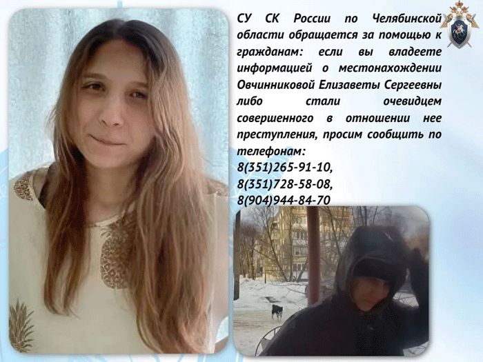«Следственное управление обращается за помощью к южноуральцам. Если вы владеете информацией о местонахождении Елизаветы либо стали очевидцем совершенного в отношении нее преступления, просим сообщить по телефонам: 8 (351)265-91-10, 8 (351) 728-58-08, 8 (904) 944-84-70 (заместитель руководителя отдела криминалистики Сергей Владимирович Кухтик)», – говорится в обращении ведомства.