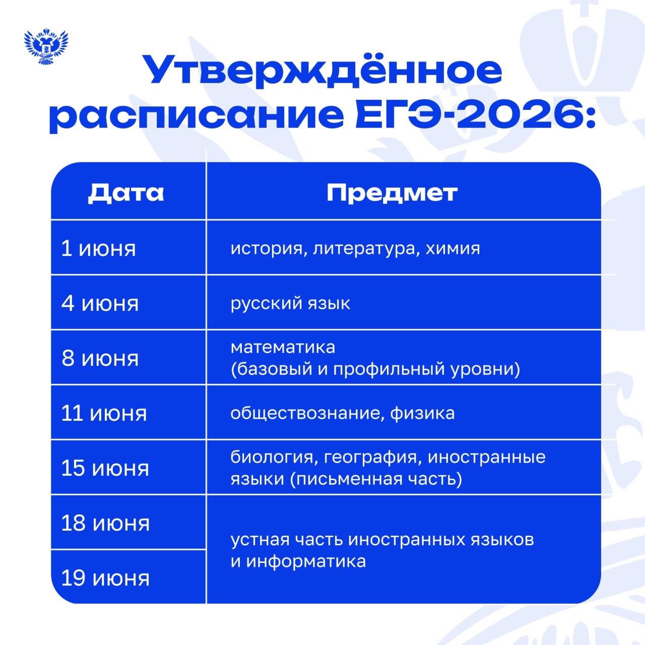 Утверждено расписание ЕГЭ и ОГЭ на 2026 год – первый экзамен назначен на 1 июня, передает корреспондент Агентства новостей «Доступ».