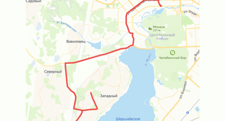 Маршрут стартует от микрорайона «Привилегия» (улица Кременкульская),далее предусмотрены остановки «IT-лицей "Привилегия"», «Микрорайон "Привилегия", «Микрорайон "Белый Хутор"», «Улица Брусничная», «Сад "Вишневый"», «Сад "Мичуринец"», «Сад "Петушок"», «Западный-2», «Развилка» (по требованию), «Поселок Шершни», «Улица Гостевая», «Улица Академика Сахарова», «Улица Академика Королева», «Улица Академика Макеева», «Улица Салавата Юлаева», «25-й микрорайон», «24-й микрорайон», «Челябинский государственный университет», «Улица Братьев Кашириных», «Улица Молодогвардейцев».