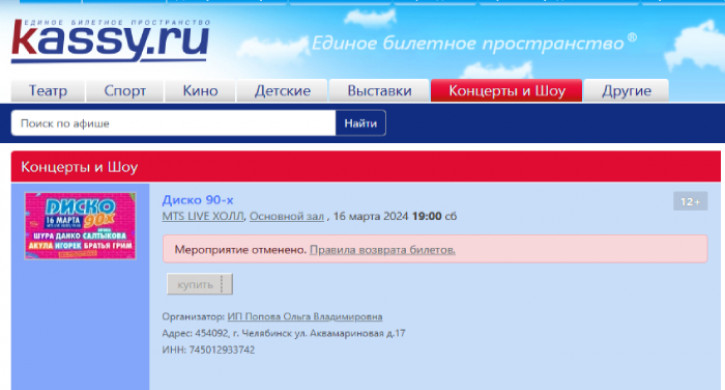 «Мероприятие "Диско 90-х", запланированное на 16 марта 2024 года в MTS LIVE ХОЛЛЕ, отменено. Приносим извинения за неудобства», – говорится в сообщении.