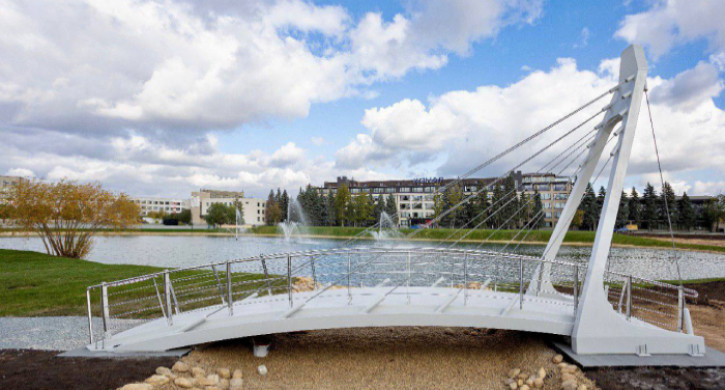 На месте технического пруда появилась прогулочная зона, а реконструированный искусственный водоем теперь украшают фонтаны. Прилегающая территория очищена от поросли, береговая линия укреплена, уложена газонная трава, обустроены пешеходные дорожки. Украшением набережной стал настоящий вантовый мост в миниатюре.