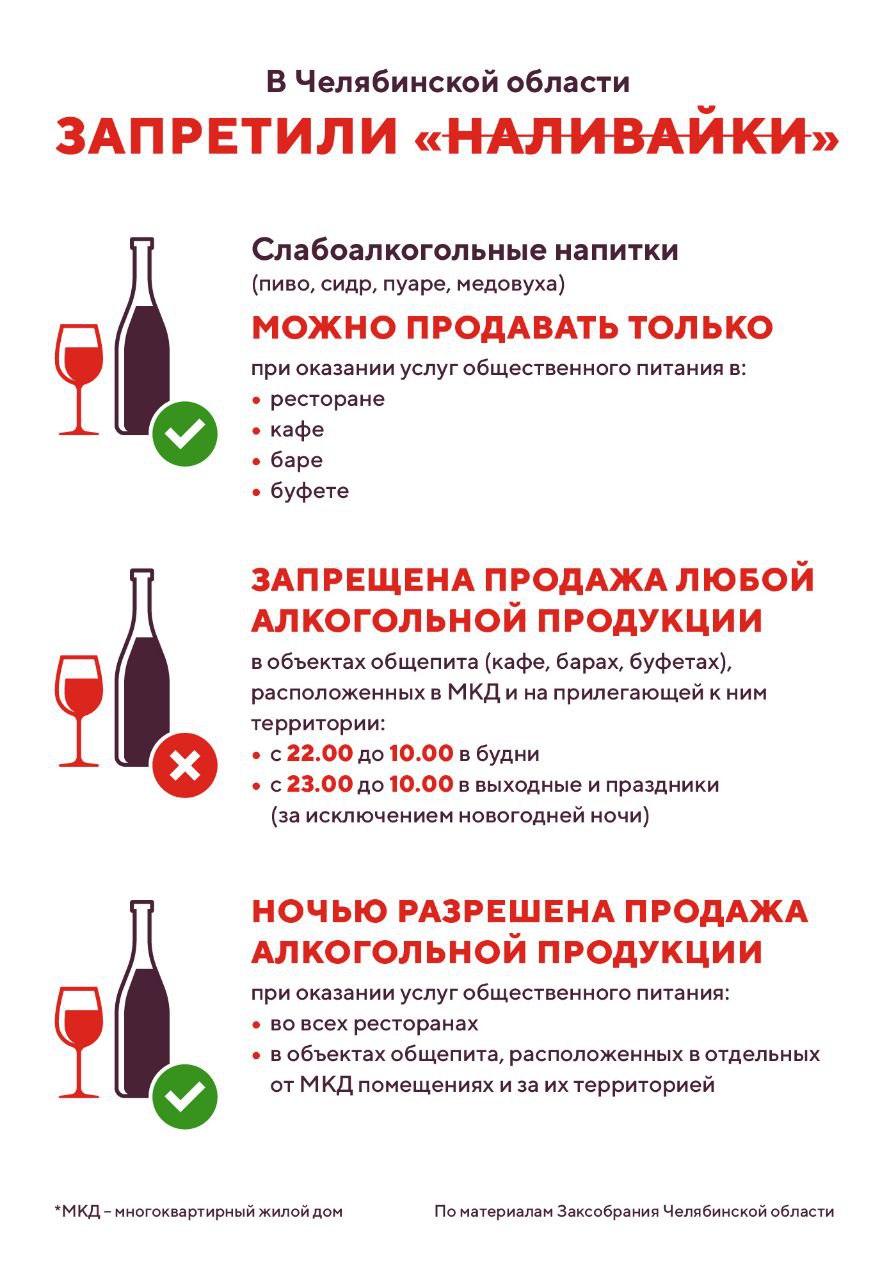 На Южном Урале принят закон, ограничивающий ночную продажу алкогольной продукции в объектах общепита, расположенных в жилых домах. На июньском заседании депутаты Заксобрания одобрили поправки в закон Челябинской области о госрегулировании оборота алкогольной продукции. О ключевых изменениях – в ИНФОГРАФИКЕ Агентства новостей «Доступ».