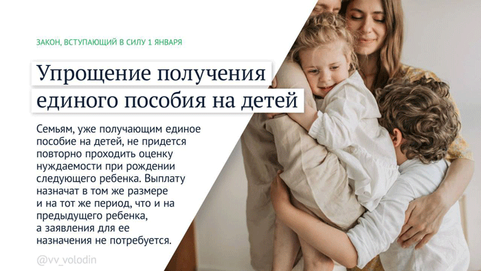 Также с 1 января вступает в силу закон, упрощающий получение единого пособия на детей. Семьям, уже получающим его, не придется повторно проходить оценку нуждаемости при рождении следующего ребенка. Выплату назначат в том же размере и на тот же период, а заявление для ее назначения не потребуется.