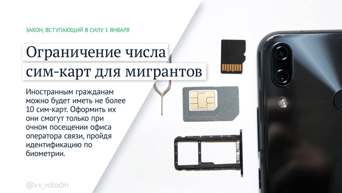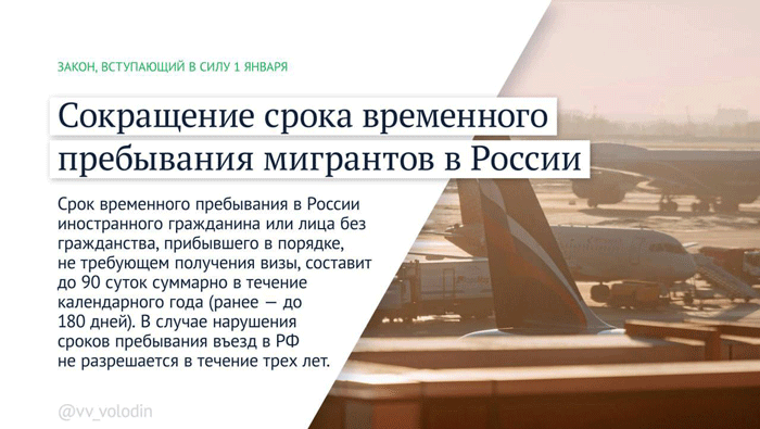 Вступают в силу нормы по совершенствованию миграционного законодательства. Среди них законы о борьбе с фиктивными браками, отцовством и материнством мигрантов; о сокращении срока временного пребывания иностранных граждан в России; об ограничении числа sim-карт, которые они смогут регистрировать на свое имя.