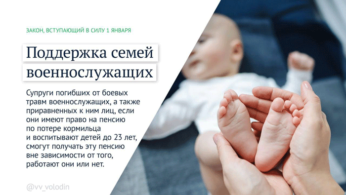 Помимо этого, супруги погибших от боевых травм военнослужащих, а также приравненных к ним лиц, если они имеют право на пенсию по потере кормильца и воспитывают детей до 23 лет, смогут получать эти выплаты вне зависимости от того, работают они или нет.