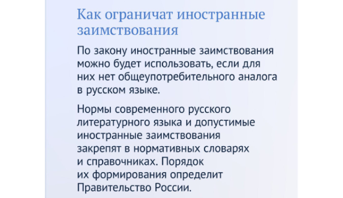 Принятый закон уменьшит употребление иностранных заимствований и расширит сферы, в которых использование русского языка станет обязательным.