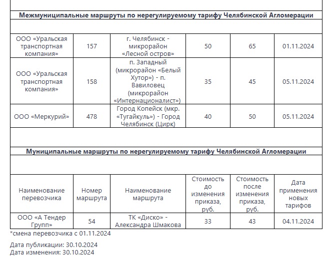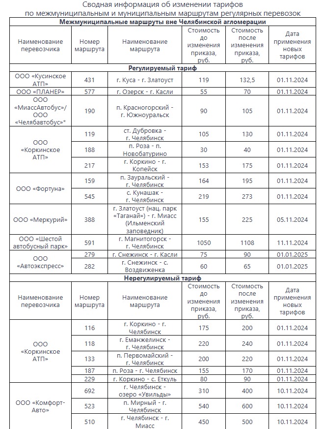 Вне Челябинской агломерации подорожание затронет маршруты № 431 – из Кусы до Златоуста; № 577 – из Озерска в Касли; № 190 – из поселка Красногорский в Южноуральск; № 119 – от станции Дубровка по Челябинска; № 188 – от поселка Роза до поселка Новобатурино; № 217 – из Коркино в Челябинск; № 159 – от поселка Зауральский до Челябинска; № 545 – из села Кунашак в Челябинск; № 388 – из Златоуста (нацпарк «Таганай») до Миасса (Ильменского заповедника); № 591 – из Магнитогорска до Челябинска; № 279 – из Снежинска в Касли и № 282 – до села Воздвиженка; № 116 – от Коркино до Челябинска; № 118 – от Еманжелинска до Челябинска; № 133 – от поселка Первомайский до Челябинска; № 187 – из поселка Роза до Челябинска; № 229 – из Коркино до села Еткуль; № 692 – из Челябинска до озера Увильды; № 523 – из поселка Мирный до Челябинска; № 510 – из Челябинска в Миасс.