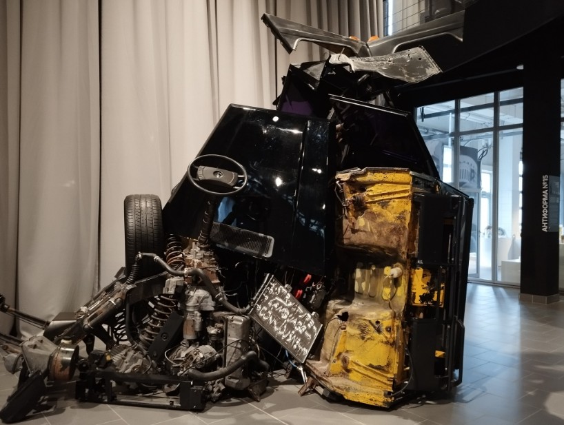 В фойе посетителей встречает эффектная инсталляция – вывернутый наизнанку Гелендваген. На первый взгляд выглядит как взрыв хаоса, на самом деле все продумано. Ни одна деталь машины не стоит на своем месте, при этом ни одну деталь не выбросили, каждый винтик пошел в дело. Это «Антиформа № 15» современного художника Василия Кононова-Гредина. «Антиформа» –значит «не-форма», лишение формы. А «№ 15» говорит нам, что существуют другие. Художник пересобрал банкомат, тренажер, холодильник и много чего еще. Искусствовед и культуролог Владимир Береснев объясняет идею автора: искусство – это волнующая бесполезность. Чтобы увидеть эстетическое, нужно разрушить утилитарное. То есть, чтобы увидеть истинную красоту автомобиля, нужно лишить его способности ехать.