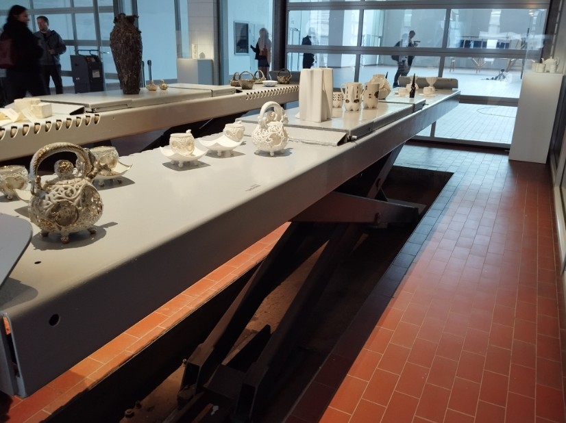 Учитывая, что музей расположен в бывшем автосалоне, символичен не только переосмысленный Гелендваген. Так, в сохранности остались и были приспособлены по-новому подъемные устройства для автомобилей. Брутальные металлические конструкции, способные выдержать не одну тонну, сейчас уставлены почти невесомым фарфором.