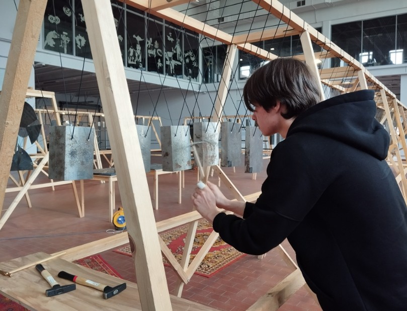 Следующий огромный зал занимает иммерсивный ксилофон, посетители с упоением ударяют молотками по металлическим формам разного размера. «Жидкий металл» – это интерактивная звуковая инсталляция Петра Айду, созданная для PERMM в соавторстве с художником Вадимом Кондаковым. Ее еще называют звуковой скульптурой. Здесь опять же главенствует мысль о взаимодействии формы и содержания. Все металлические конструкции сделаны из одного и того же материала, даже вес у них одинаковый. Только форма разная. Какие-то раскатаны в листы, какие-то спрессованы в параллелепипеды. И вот разность форм дает разный звук, можно играть партитуры.