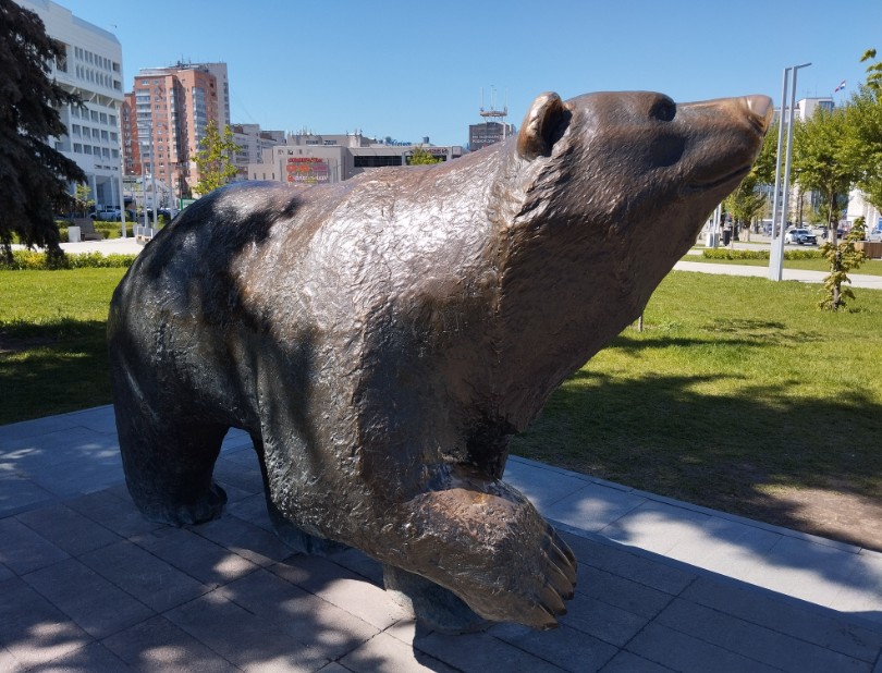 Недалеко – еще один символ Перми, который красуется и на гербе края. Медведь – покровитель коренных народов. Его клыки охотники носили как обереги. С ним связана древнейшая мифология о появлении на свет первого настоящего человека через любовный союз потомка медведя и колдуньи. Но кроме таких глубинных смыслов, есть и еще один, ироничный – так пермяки высмеяли расхожий стереотип в представлении иностранцев, что в России по улицам ходят медведи. А в последние годы у грозного мишки появилась и еще одна функция – дарить жителям и гостям города счастье и везение. Загадывать желание надо, натирая косолапому нос.