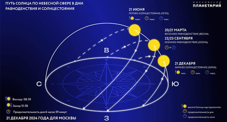«В северном полушарии наступит астрономическая зима, а в южном – лето. При этом в северном полушарии наблюдается самый короткий световой день и самая длинная ночь», – говорится в комментарии Московского планетария.