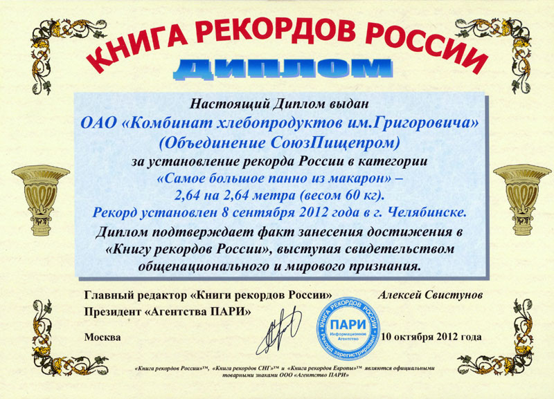 Торговая марка «Царь» (Объединение «СоюзПищепром») официально признана российским рекордсменом: экспертная комиссия Книги Рекордов России единогласно подтвердила установку рекорда на создание самого большого в стране панно из макарон. Специальный диплом передан в Челябинск и торжественно вручен представителям Комбината хлебопродуктов им. Григоровича – головной компании Объединения, передает корреспондент Агентства новостей «Доступ».