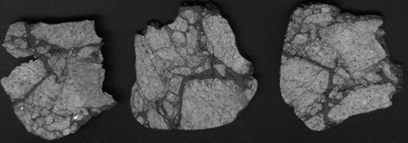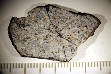 Первые исследования фрагментов метеорита позволили ученым сделать вывод, что он неоднороден. На распилах образцов видны округлые образования (хондры) и трещинки (жилки), заполненные ударным расплавом.