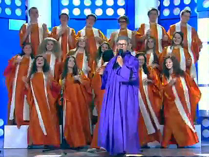 Пока длится проповедь, «церковный» хор поет восхваляющую песню: «Он прилетел, распугал детвору, в бюджете дыру собой залепил, миллиард подарил». А служитель культа, которого играет Сергей Нетиевский, заключает: «Наконец, из космоса упало что-то ценное, и это не спутник Роскосмоса».