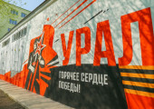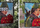 В Магнитогорске рекламными листовками обклеили стрит-арт к 80-летию Великой Победы