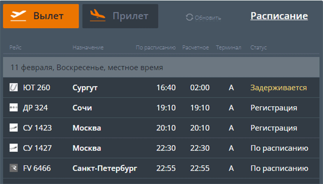 Время вылета по расписанию 16.30, планируемое – 22.30.
