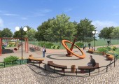 По всему периметру сквера проложены широкие тротуары, установлены опоры наружного освещения, размещены качели, множество скамеек и урн.