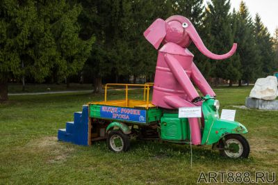 Альтернативное название композиции с розовым слоном – «Индия – Россия – Дружба». Тогда свою задумку техноскульптор прокомментировал так: «Продается старый мотороллер под названием "Муравей". И откуда-то рождается скульптура "Слон на Муравье". Так как фестиваль "ЛОМ" международный, то садим индийского слона на тульский грузовой мотороллер "Муравей", и получается "Индия – Россия – Дружба"».